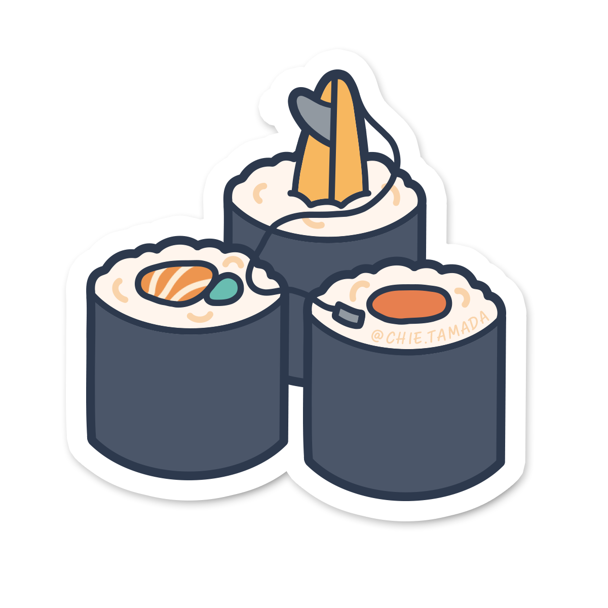 The perfect sticker to add to your notebooks, laptop, and water bottle. Featuring a playful illustration of yummy sushi rolls with a hidden surfboard.