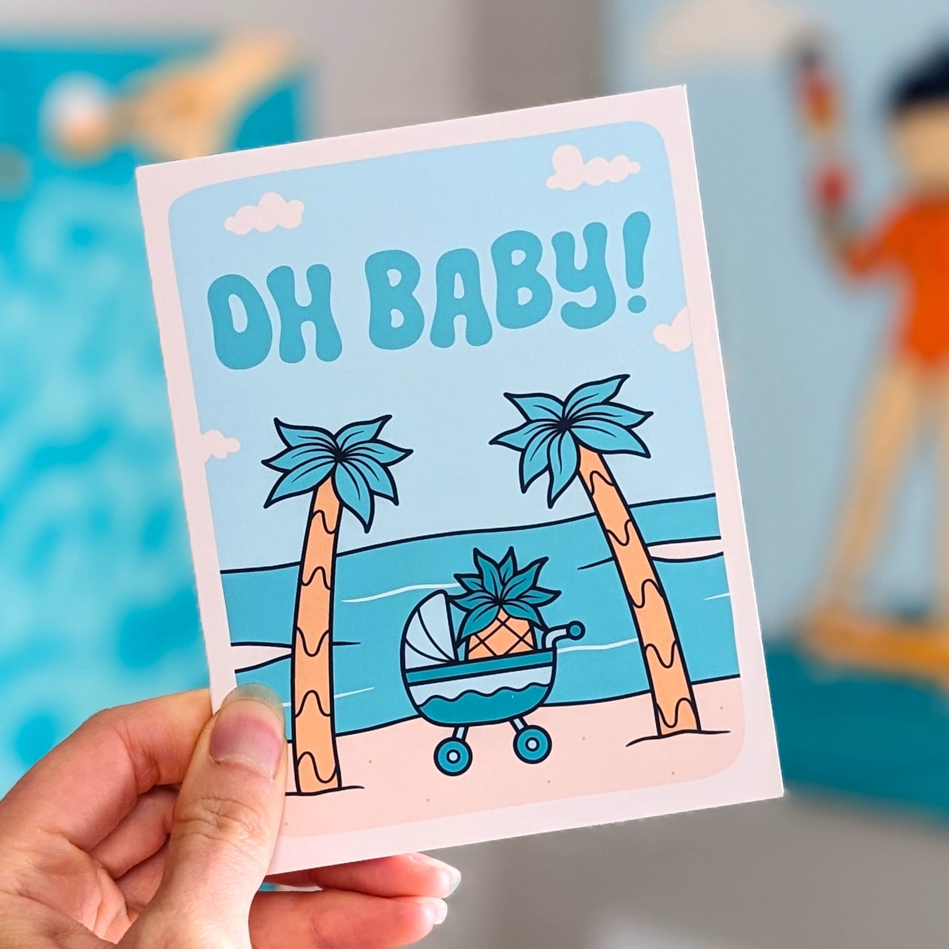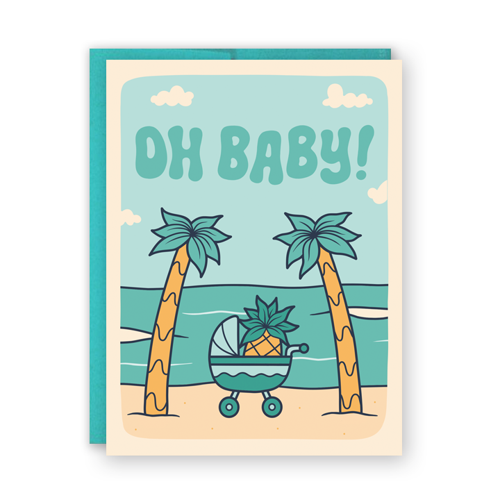 The perfect card to congratulate your beach-loving couple on welcoming a new baby! Featuring playful illustrations of palm trees and pineapples at the beach.