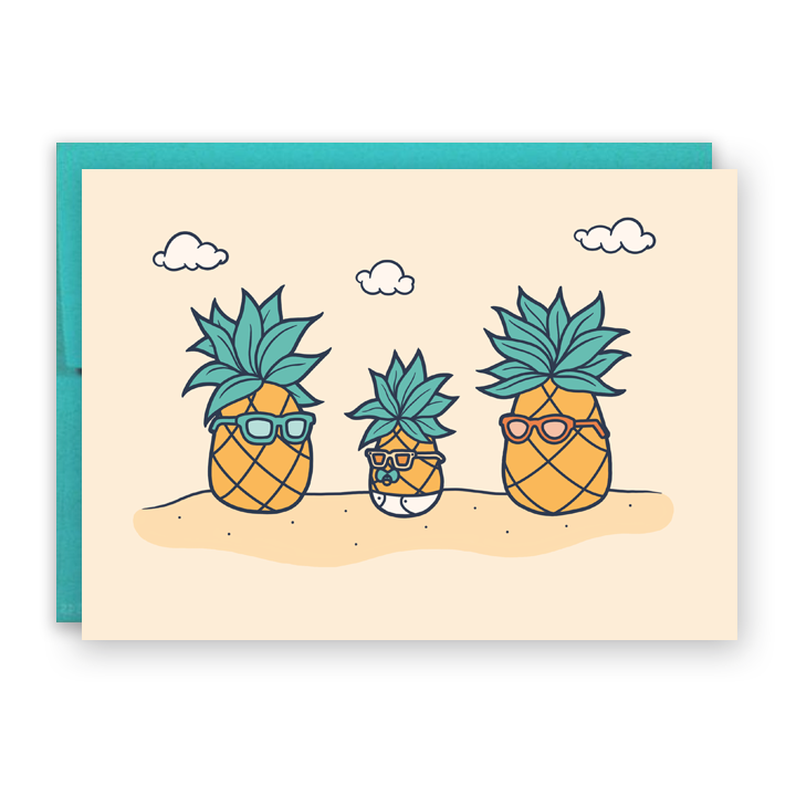 The perfect card to congratulate your beach-loving couple on welcoming a new baby! Featuring playful illustrations of pineapples at the beach.