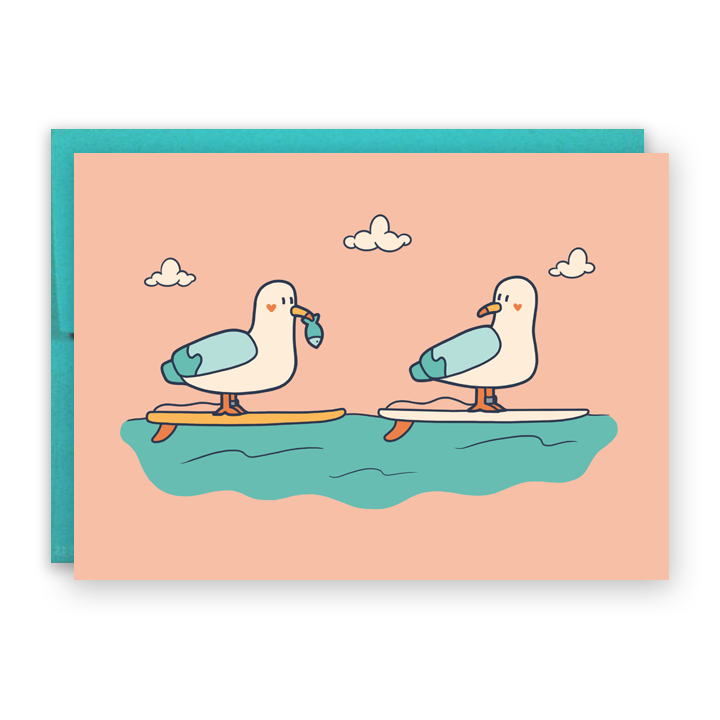 The perfect card to send love to your favorite surfer friend. Featuring playful illustrations of seagulls surfing in the ocean.