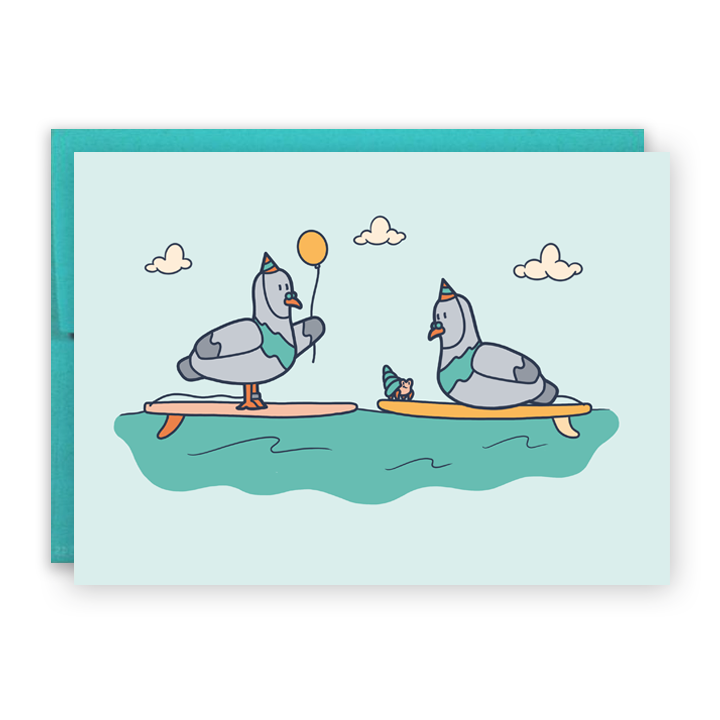 The perfect card to wish your favorite surfer friend a happy birthday! Featuring playful illustrations of pigeons surfing in the ocean.