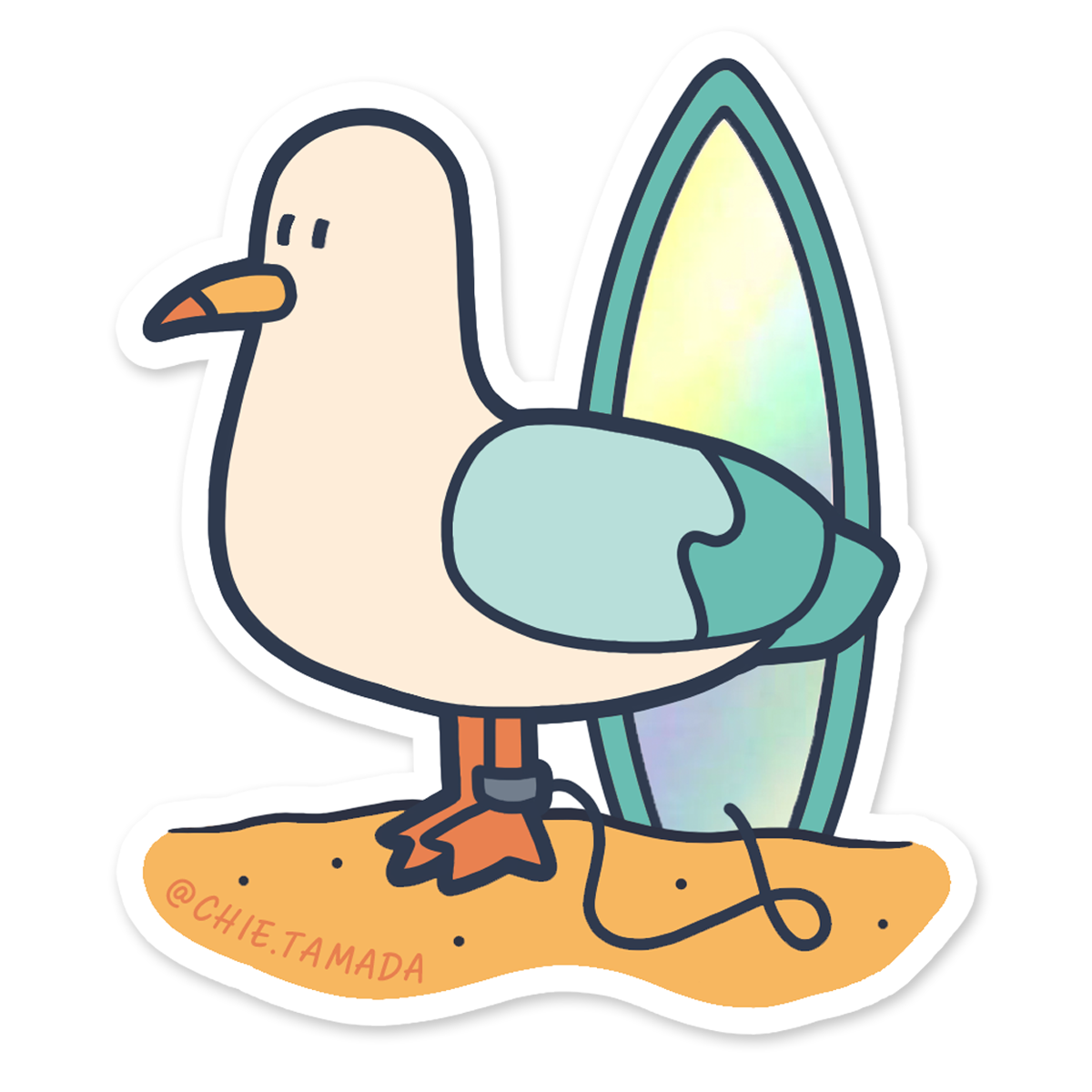 The perfect sticker to add to your notebooks, laptop, and water bottle. Featuring a playful illustration of a seagull with a hologoraphic surfboard.